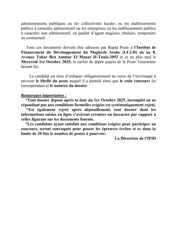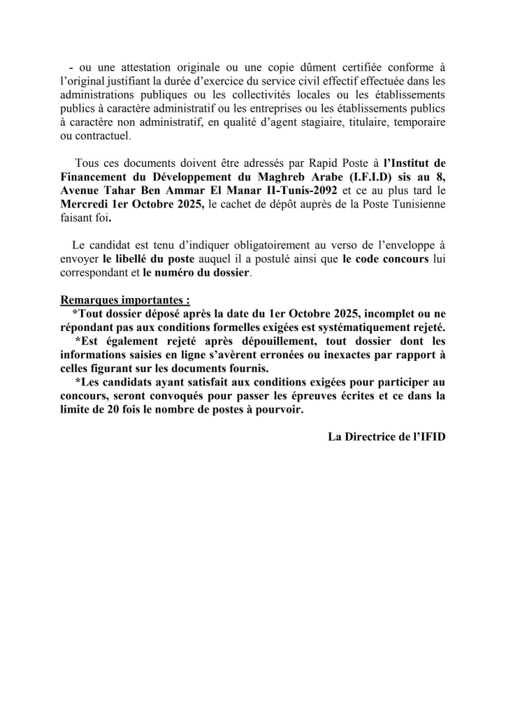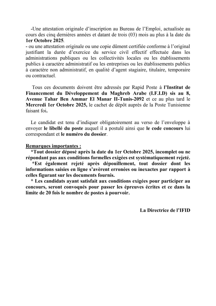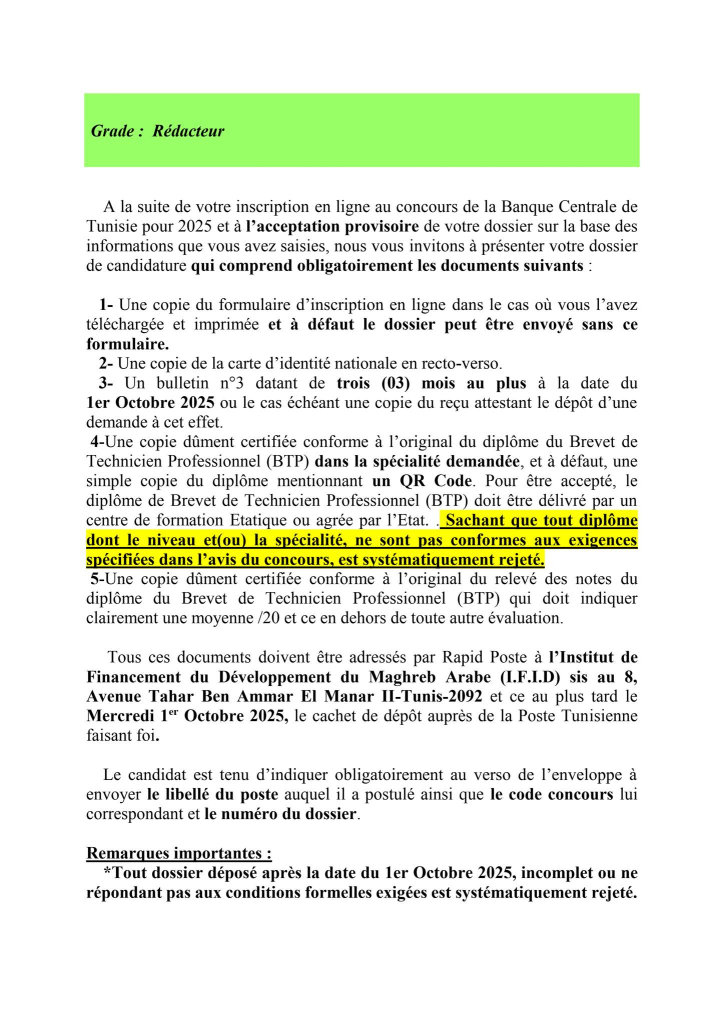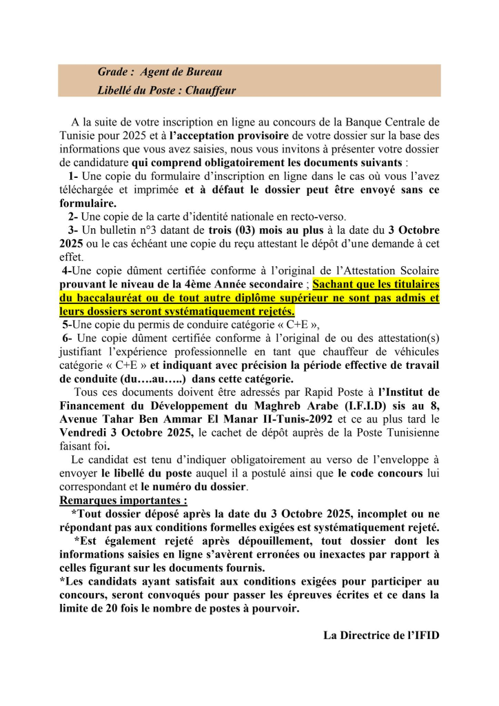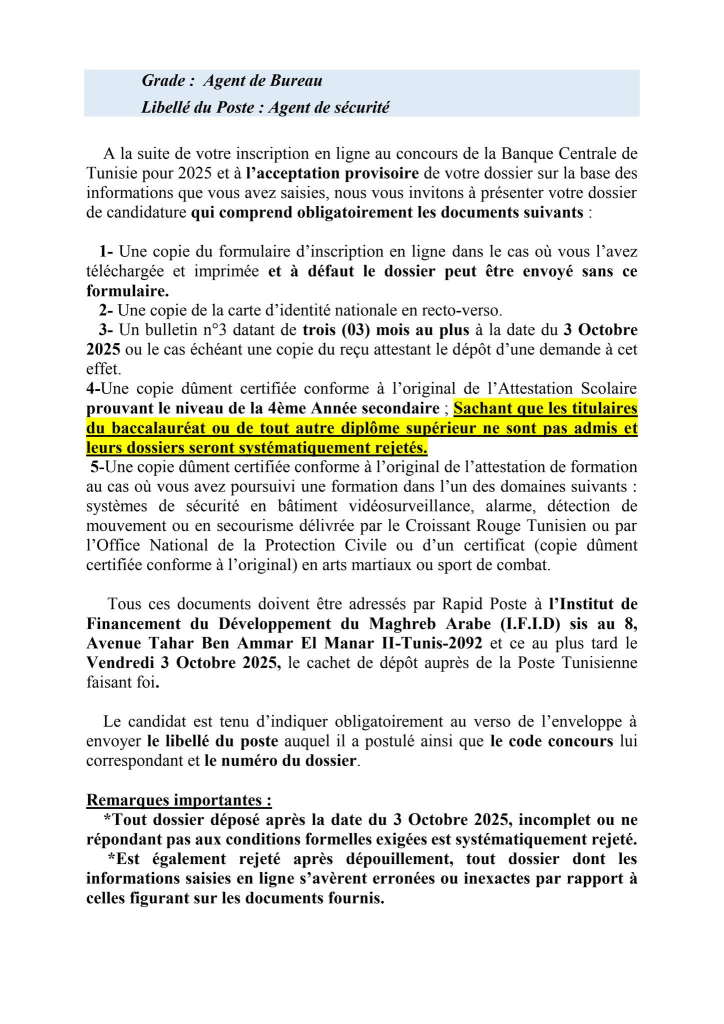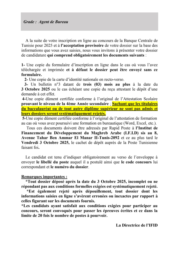 Les candidats au concours externe de la Banque Centrale de Tunisie qui ont reçu un SMS à compter du 14 Septembre 2025 et jours suivants , les informant qu’ils ont été retenus pour envoyer leur dossier de candidature à l’institut de Financement du Développement du Maghreb Arabe(IFID) et qui n’ont pas reçu un mail dans le même sens , peuvent consulter la liste des pièces exigées et la date limite d’envoi, en cliquant sur l’un des liens ci-après et ce en fonction du poste auquel le candidat a postulé :