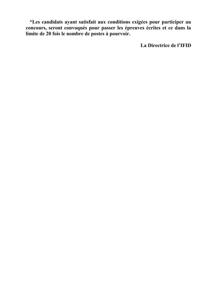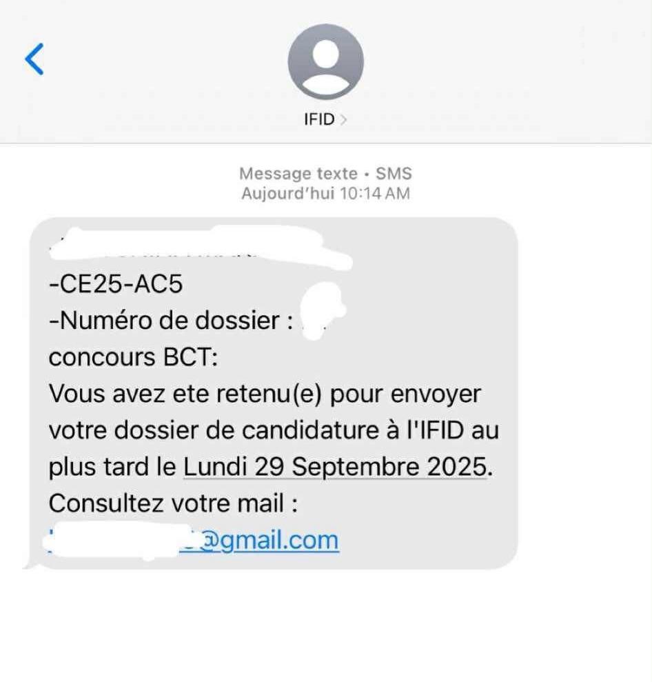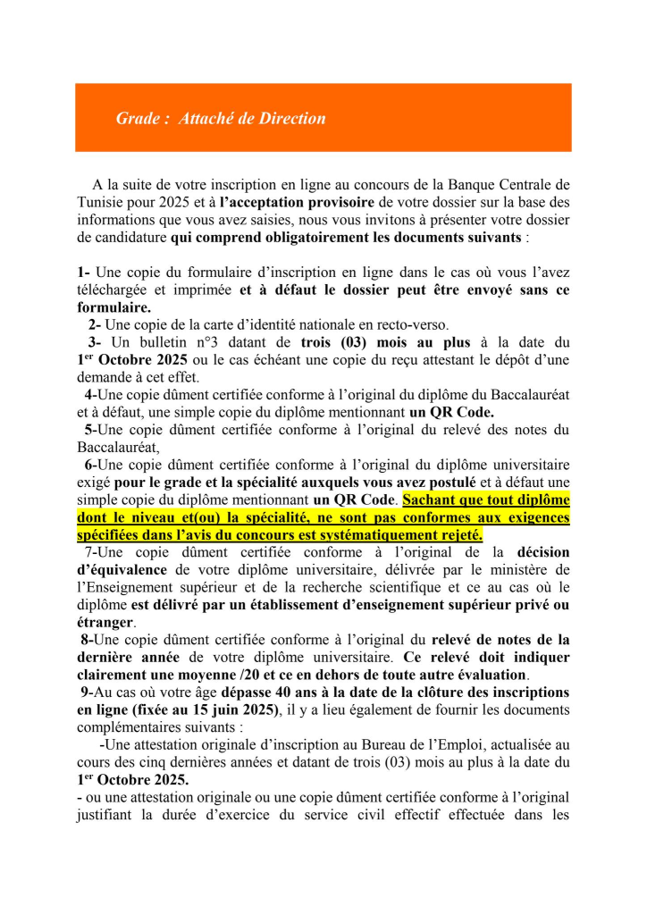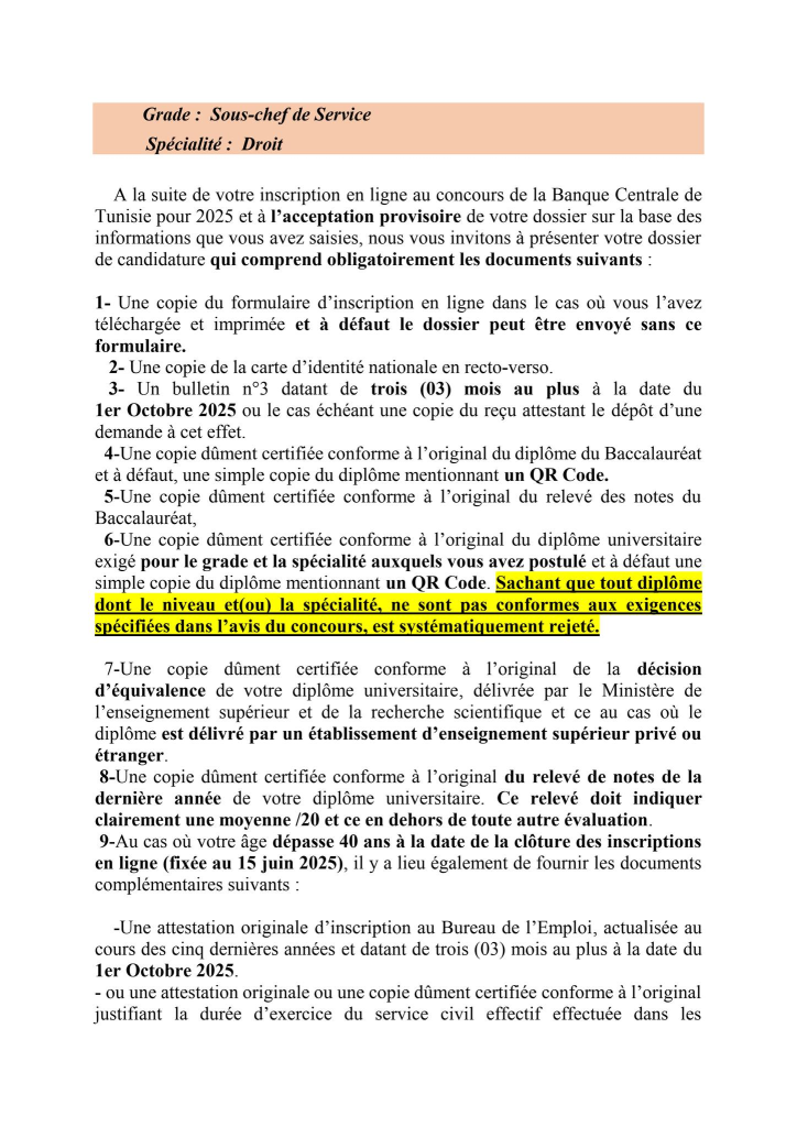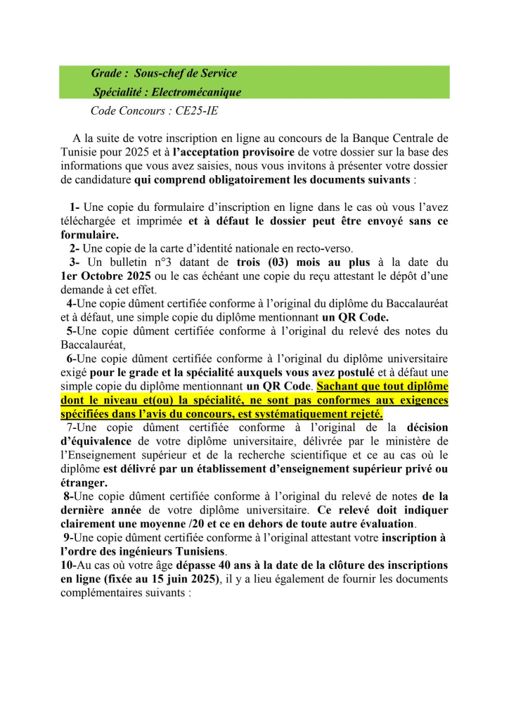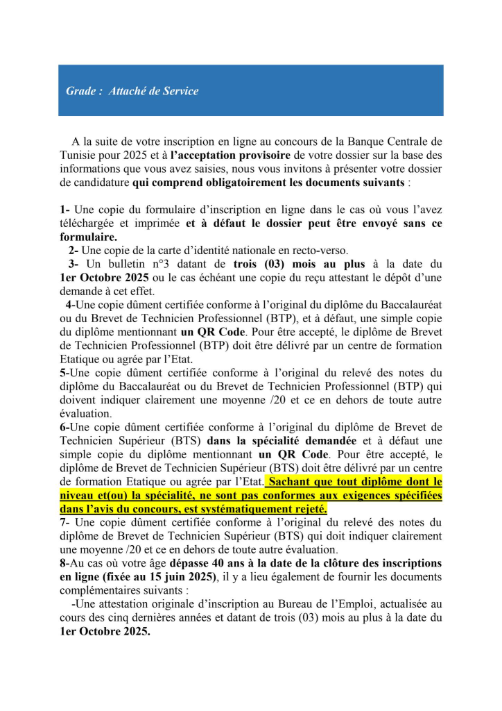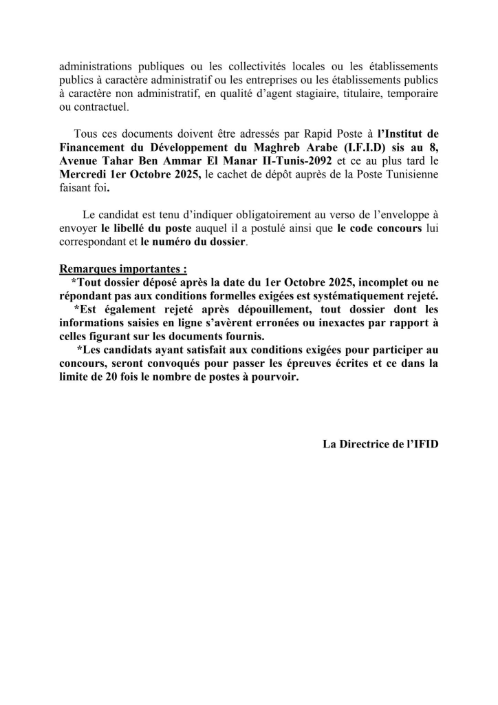 Les candidats au concours externe de la Banque Centrale de Tunisie qui ont reçu un SMS à compter du 14 Septembre 2025 et jours suivants , les informant qu’ils ont été retenus pour envoyer leur dossier de candidature à l’institut de Financement du Développement du Maghreb Arabe(IFID) et qui n’ont pas reçu un mail dans le même sens , peuvent consulter la liste des pièces exigées et la date limite d’envoi, en cliquant sur l’un des liens ci-après et ce en fonction du poste auquel le candidat a postulé :