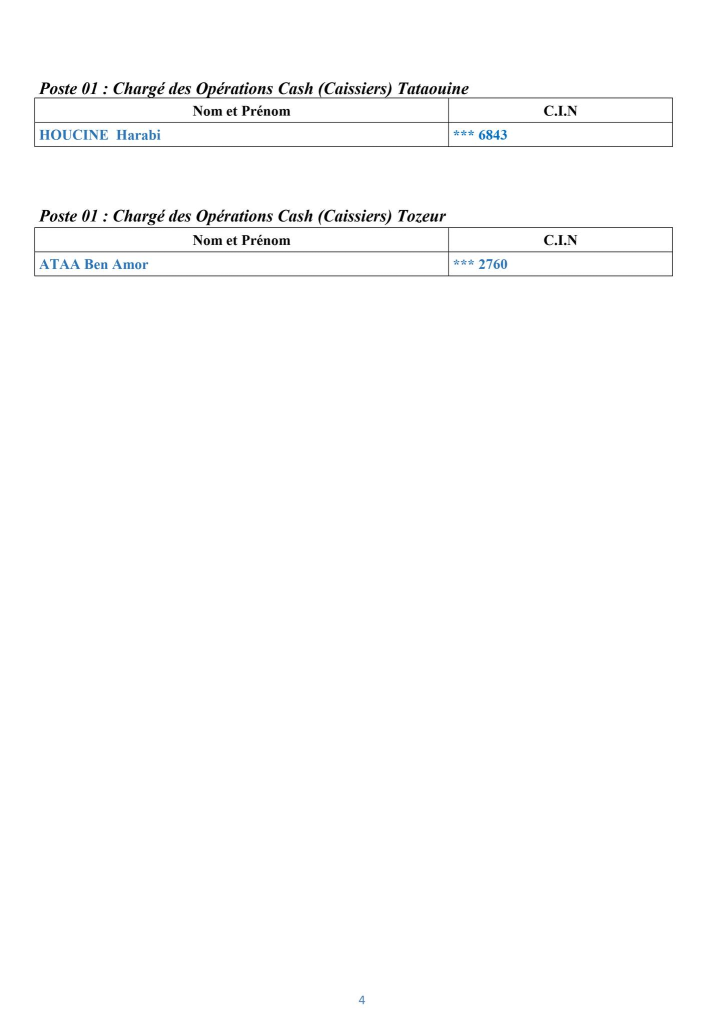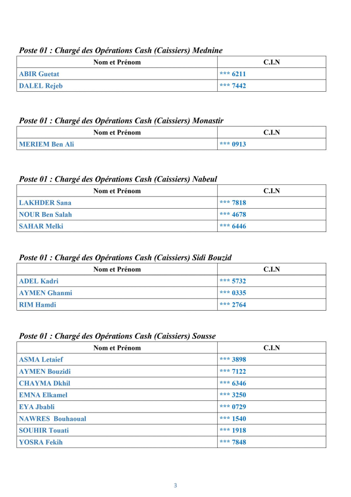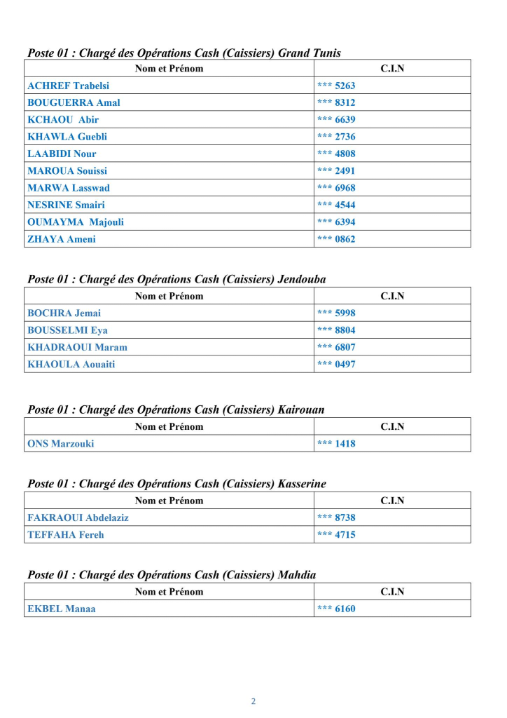 Pour consulter la liste des candidats retenus pour le poste n°1 : Chargé des Opérations Cash (Caissier) ,
