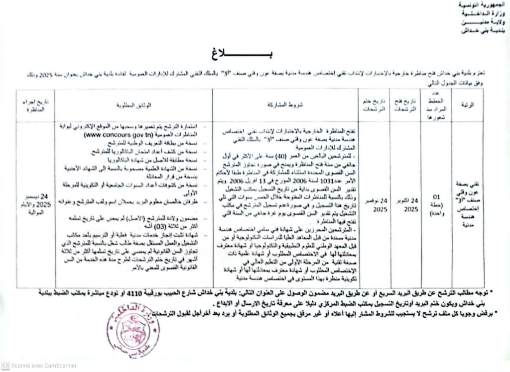 بــــــــــــــــلاغ حول إجراء مناظرة خارجية بالاختبارات لانتداب تقني (اختصاص هندسة مدنية) عن طريق التعاقد بالسلك التقني المشترك للإدارات العمومية لقائدة بلدية تستور بعنوان سنة 2025.