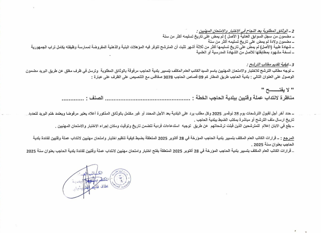 | بلدية بير الحفي | سائق في الوزن الثقيل | 2 | 2025-08-29 | 2025-12-31 |