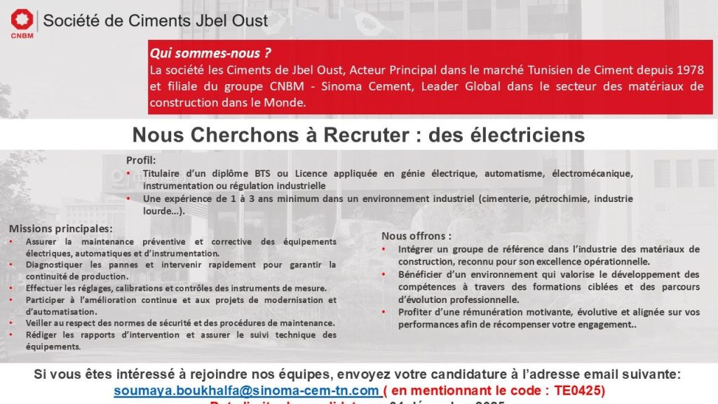 📩 Envoyez votre CV à : soumaya.boukhalfa@sinoma-cem-tn.com