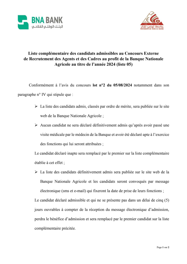 LISTE COMPLÉMENTAIRE DES CANDIDATS ADMISSIBLES AU CONCOURS EXTERNE DE RECRUTEMENT DES AGENTS ET DES CADRES AU PROFIT DE LA BANQUE NATIONALE AGRICOLE AU TITRE DE L’ANNÉE 2024 (LISTE 05)