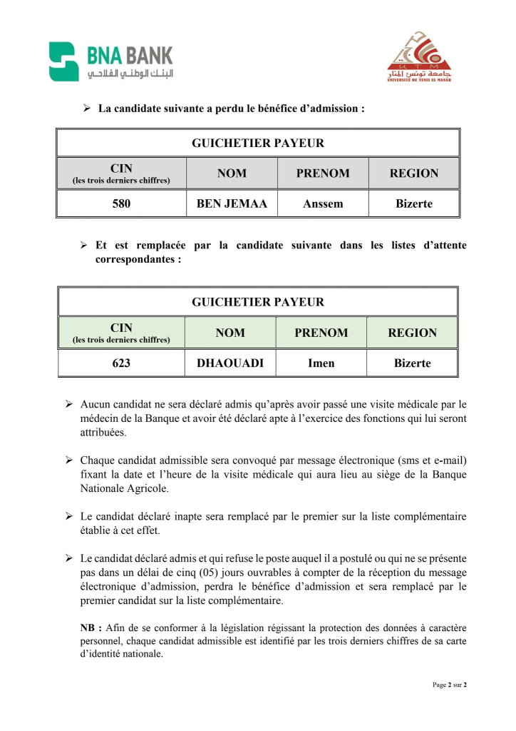 La Banque Nationale Agricole déclare admissibles les candidats du Groupe 02 les noms sont mentionnés ci-dessous par ordre de mérite.
