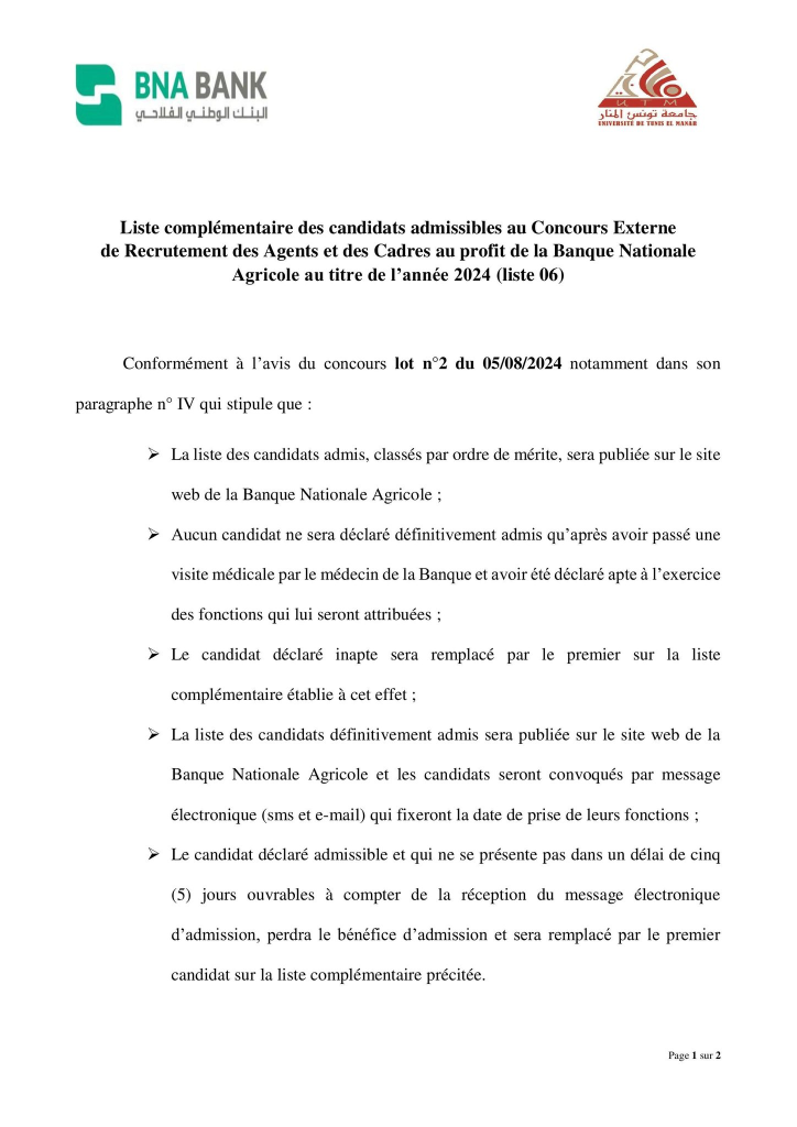 LISTE COMPLÉMENTAIRE DES CANDIDATS ADMISSIBLES AU CONCOURS EXTERNE DE RECRUTEMENT DES AGENTS ET DES CADRES AU PROFIT DE LA BANQUE NATIONALE AGRICOLE AU TITRE DE L’ANNÉE 2024 (LISTE 06)