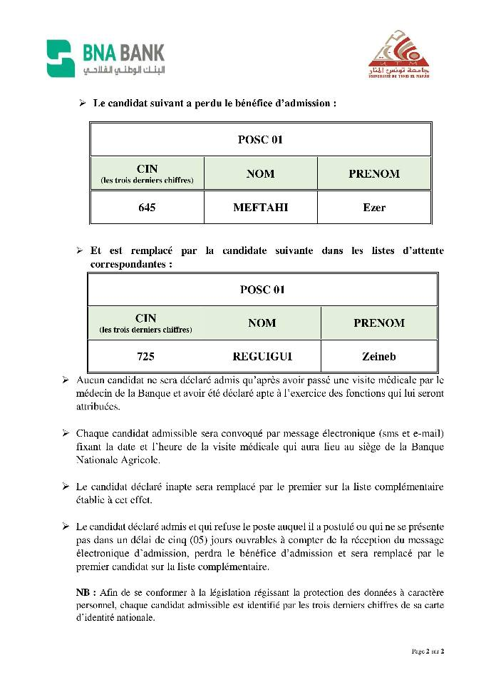 La liste des candidats définitivement admis sera publiée sur le site web de la Banque Nationale Agricole et les candidats seront convoqués par message électronique (sms et e-mail) qui fixeront la date de prise de leurs fonctions.