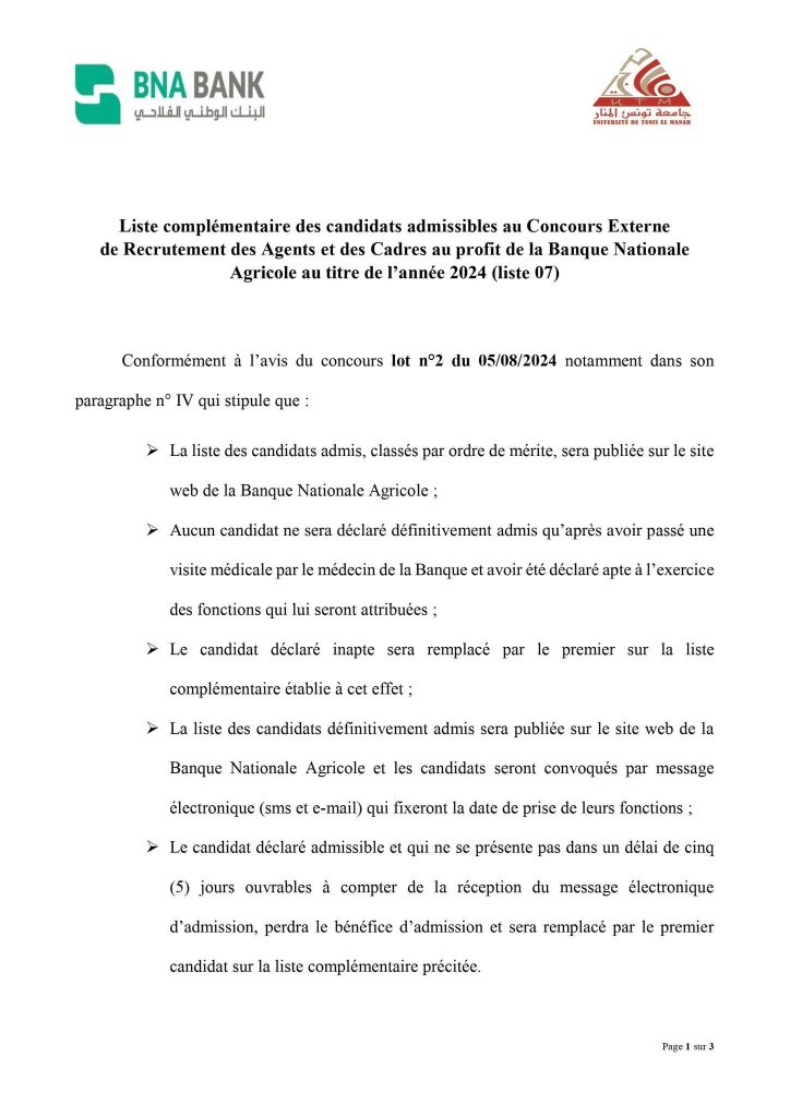 Liste complémentaire des candidats admissibles au Concours Externe de Recrutement des Agents et des Cadres au profit de la Banque Nationale Agricole au titre de l’année 2024 (liste 07)