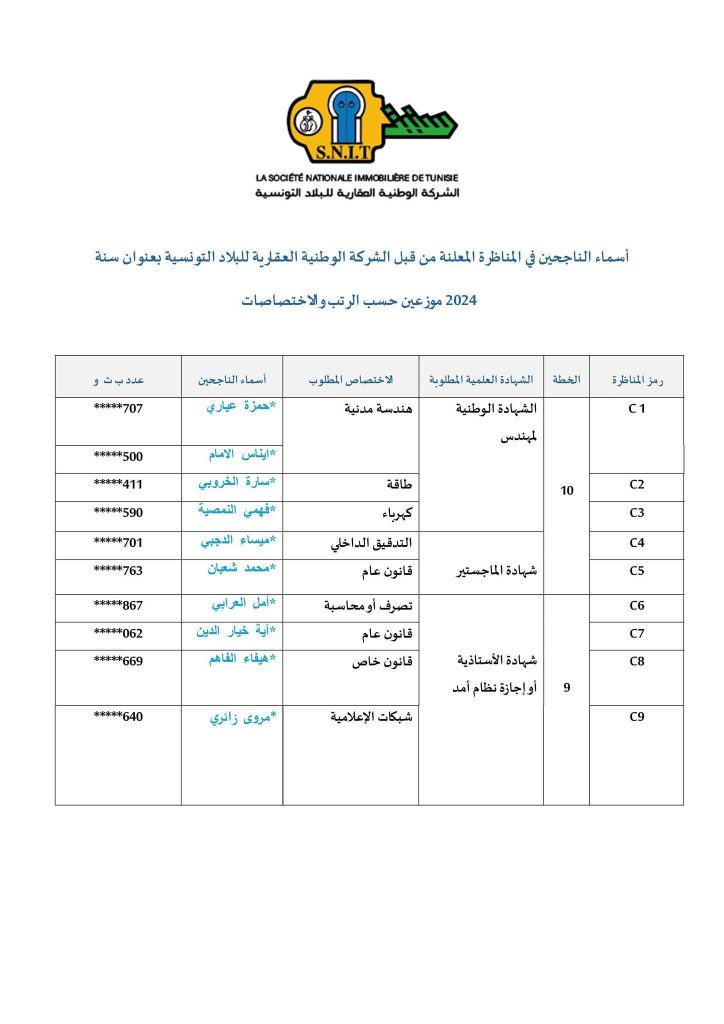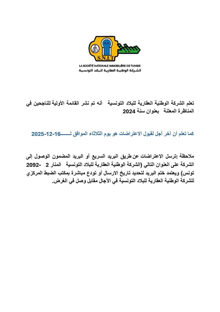 بلاغ خاص بمناظرة “الشركة الوطنية العقارية للبلاد التونسية Snit ” لإنتداب عديد الإختصاصات