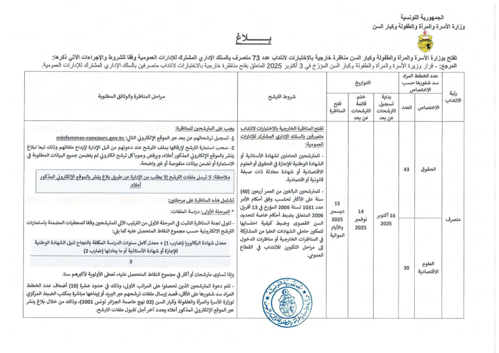 مناظرة وزارة الأسرة و المرأة و الطفولة لانتداب 73 متصرفا شهادة الإجازة أو الاستاذية : آخر أجل 14 نوفمبر 2025