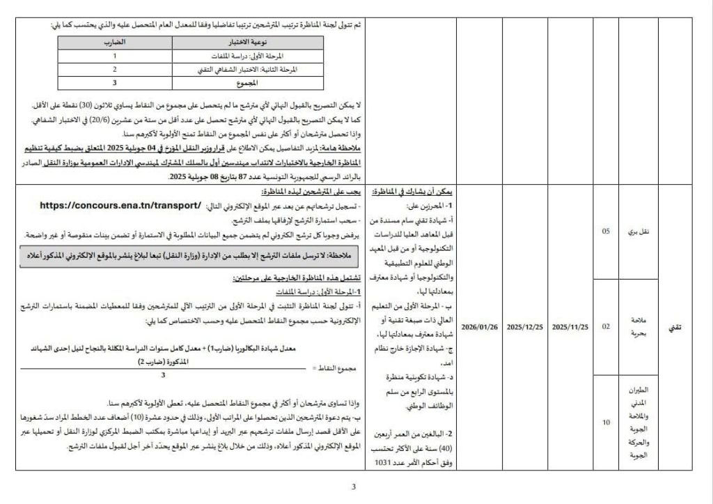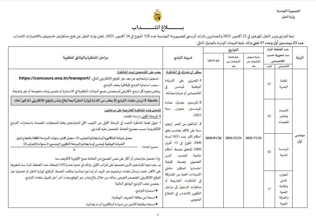 مناظرة وزارة النقل لإنتداب 40 خطة في عديد الاختصاصات : آخر أجل 25 ديسمبر 2025