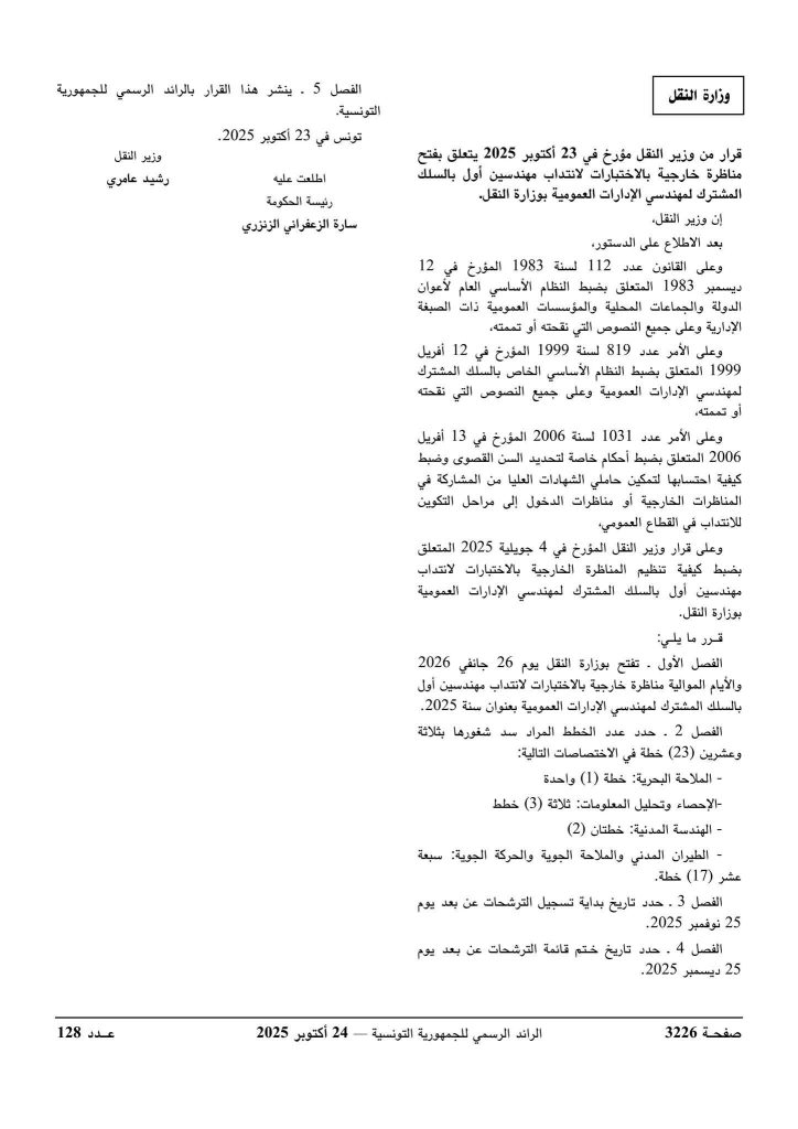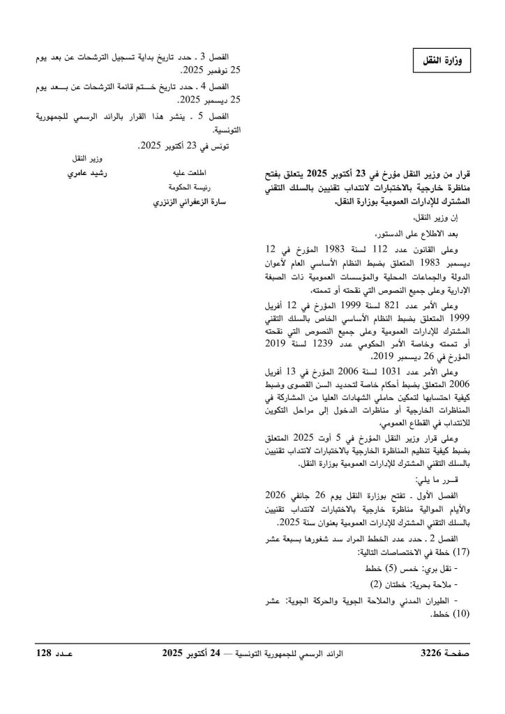 مناظرة وزارة النقل لإنتداب 40 خطة في عديد الاختصاصات : آخر أجل 25 ديسمبر 2025