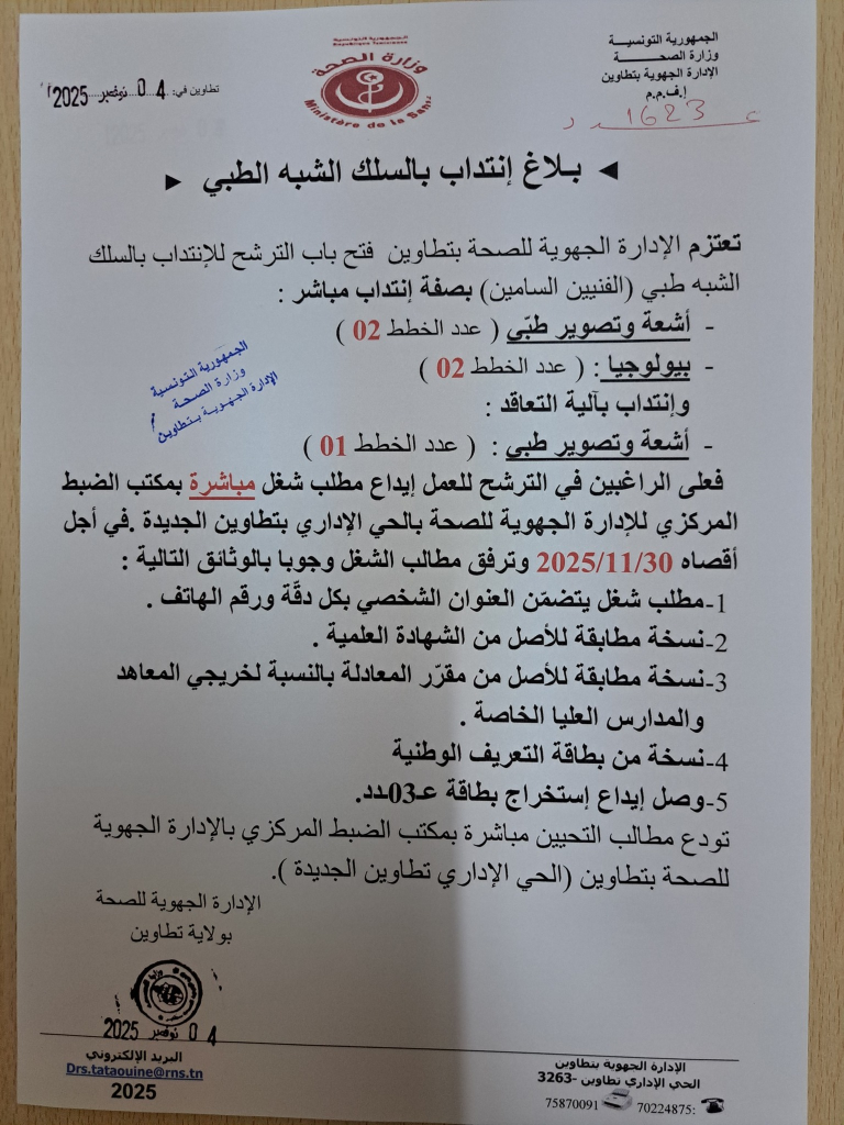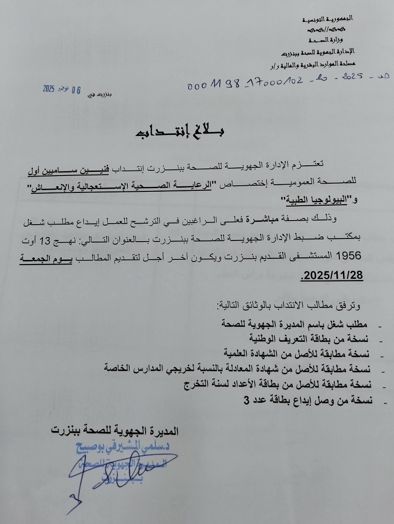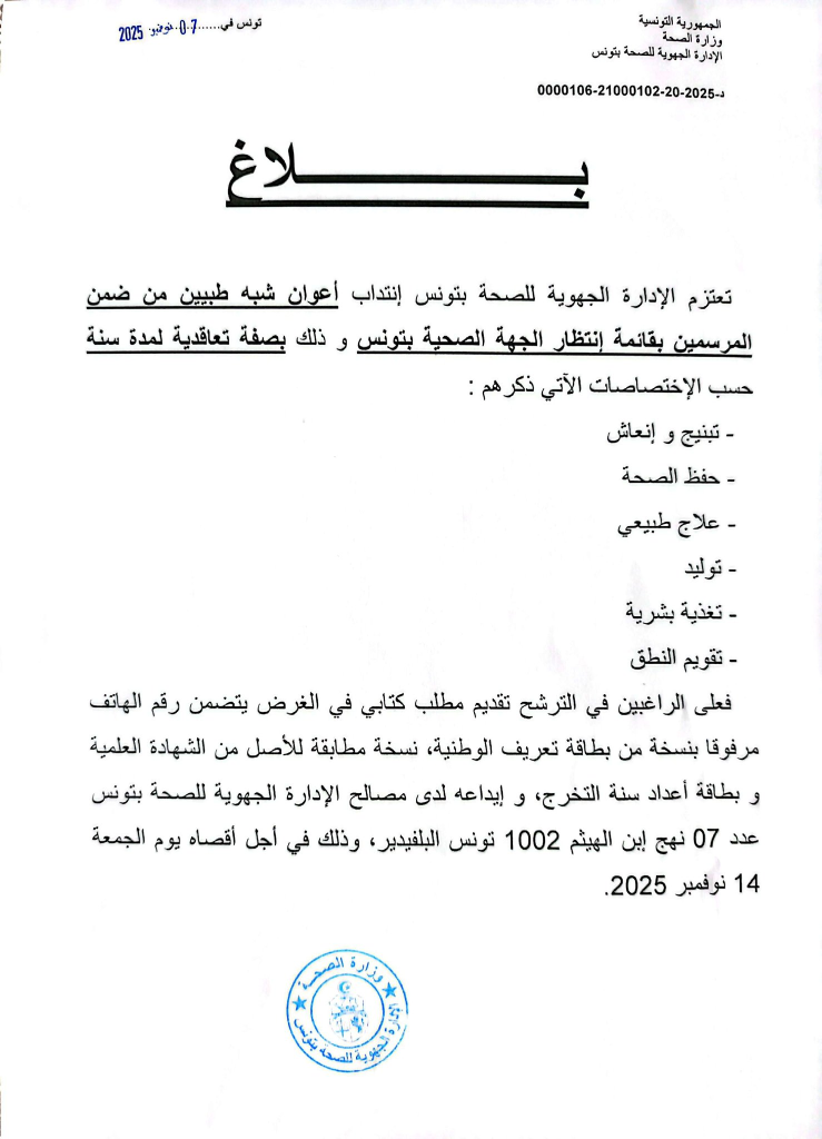 مناظرة وزارة الصحة لإنتداب عديد الاختصاصات في إطار الإنتداب المباشر بعنوان سنة 2025