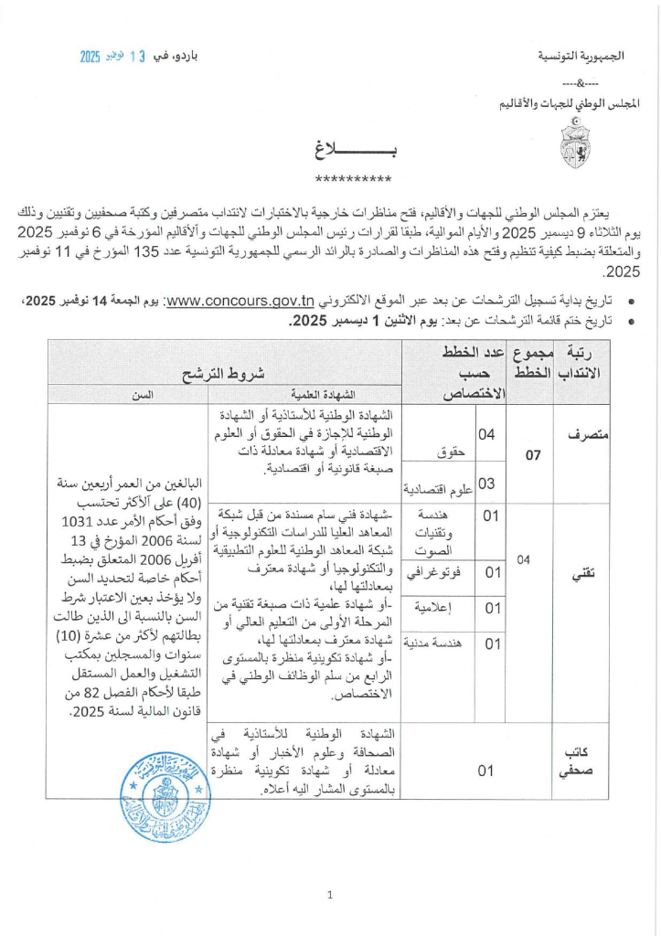 مناظرة المجلس الوطني للجهات و الأقاليم لإنتداب عديد الإختصاصات : آخر أجل 01 ديسمبر 2025