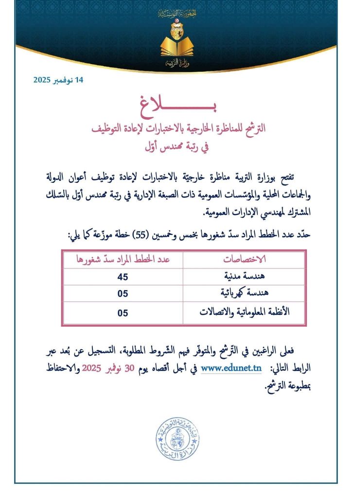 مناظرة وزارة التربية لإعادة توظيف 55 خطة في عديد الاختصاصات : آخر أجل 30 نوفمبر 2025