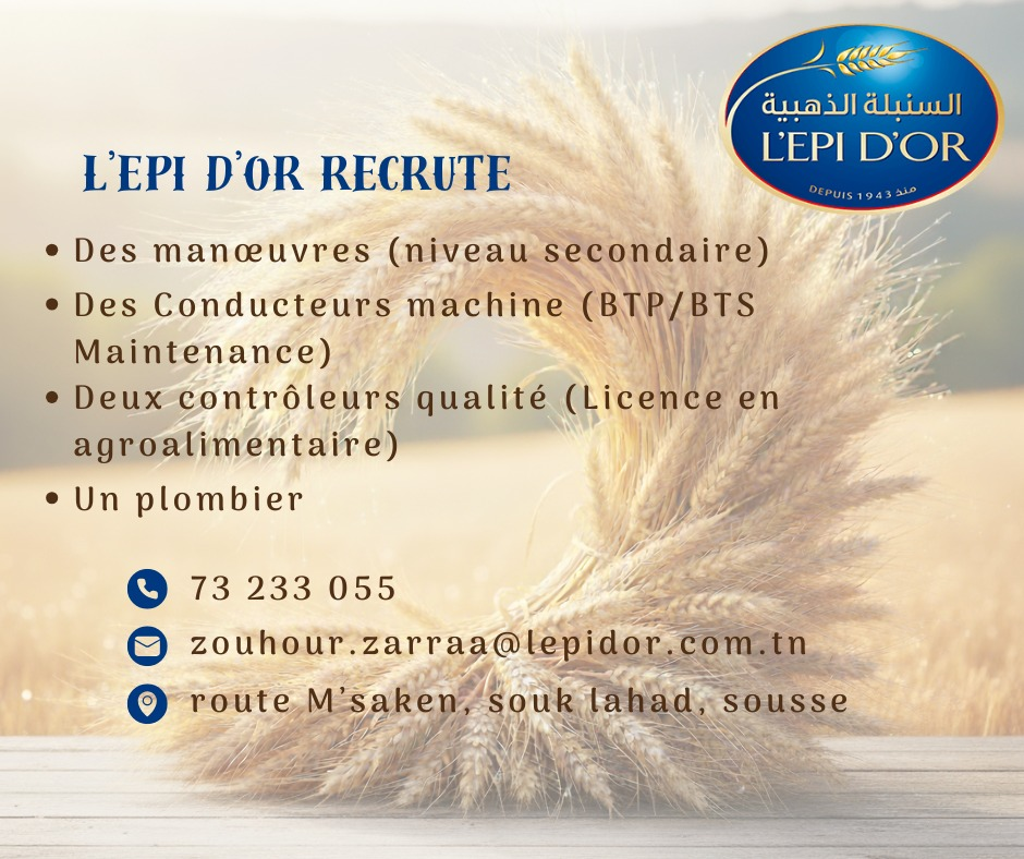 شركة السنبلة الذهبية L’EPI D’OR تنتدب عملة و مراقبي جودة و عديد الإختصاصات