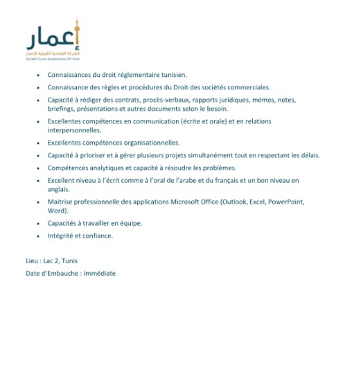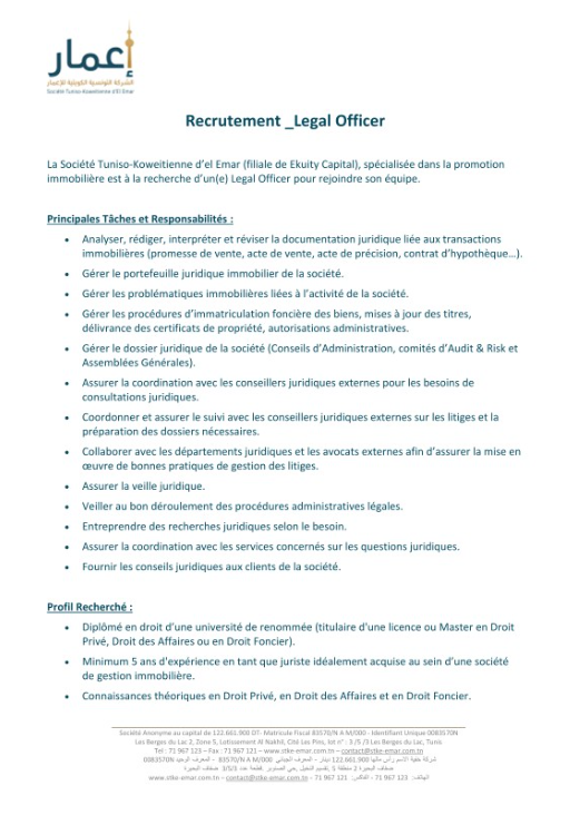 La Société Tuniso-Koweitienne d’el Emar (filiale de Ekuity Capital), spécialisée dans la promotion immobilière est à la recherche d’un Legal Officer pour rejoindre son équipe.