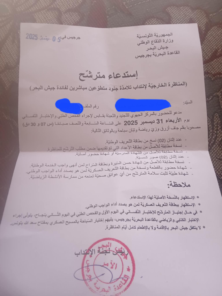 إعلان انتداب جنود متطوعين مباشرين لفائدة وزارة الدفاع الوطني (جيش البحر) بعنوان السنة التكوينية 2025 – 2026