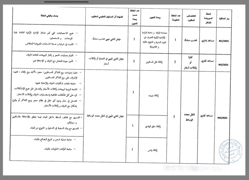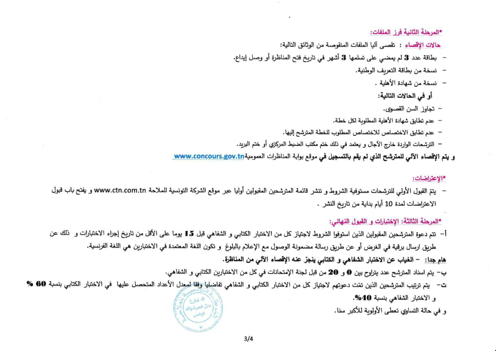 تعلن الشركة التونسية للملاحة عن فتح مناظرة خارجية بالملفات و الاختبارات لانتداب 61 إطار و عون إداري في اختصاصات مختلفة.