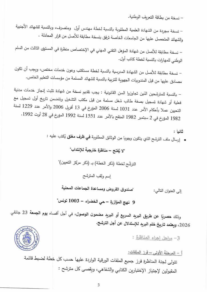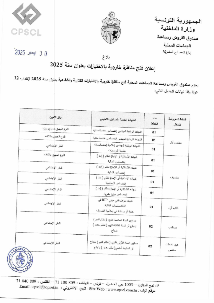 مناظرة صندوق القروض ومساعدة الجماعات المحلية لإنتداب أعوان و إطارات : آخر أجل 20 جانفي 2026
