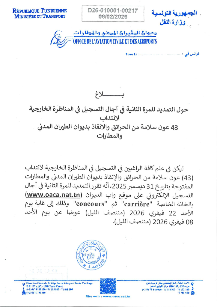 مناظرة ديوان الطيران المدني والمطارات لانتداب 43 عون مستوى بكالوريا : آخر أجل 22 فيفري 2026