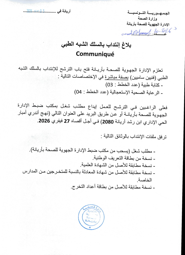 مناظرة وزارة الصحة لإنتداب عديد الاختصاصات في إطار الإنتداب المباشر بعنوان سنة 2026