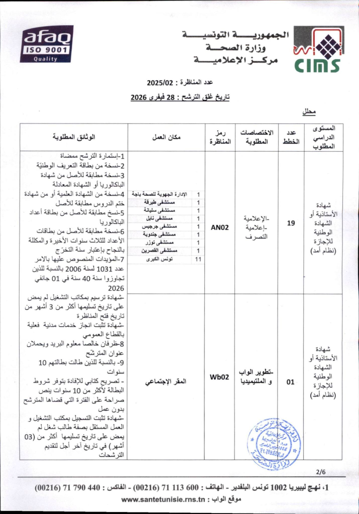 مناظرة مركز الإعلامية لوزارة الصحة للإنتداب : آخر أجل 28 فيفري 2026