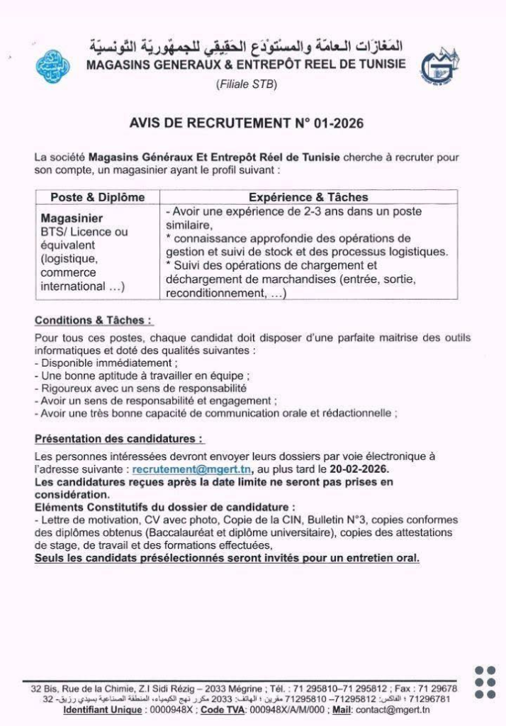 تعلن شركة المغازات العامة والمستودع الحقيقي للجمهورية التونسية (فرع STB) عن رغبتها في انتداب عون مخزن للعمل ضمن فريقها.