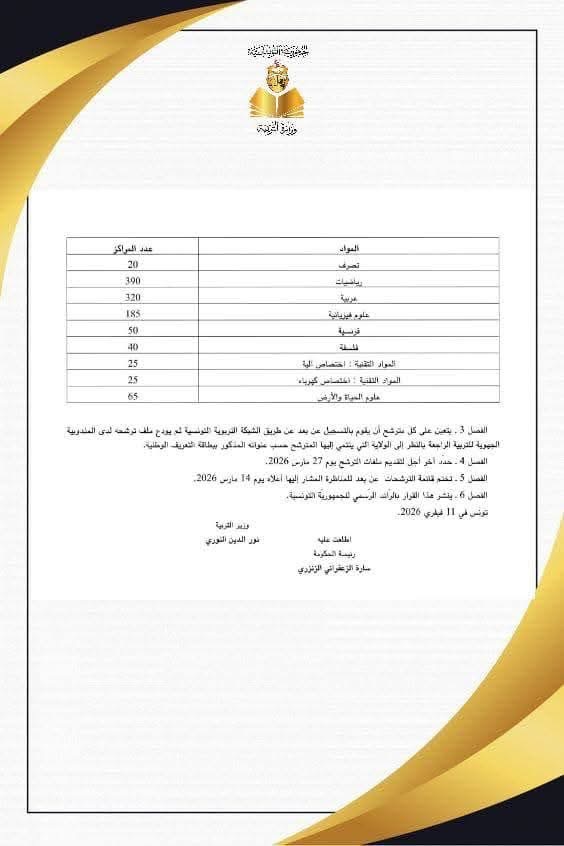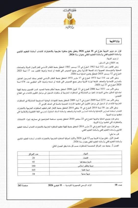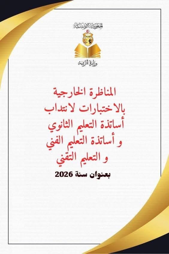 وزارة التربية : فتح مناظرة خارجية لانتداب 1630 أساتذة التعليم الثانوي والفني والتقني بعنوان سنة 2026