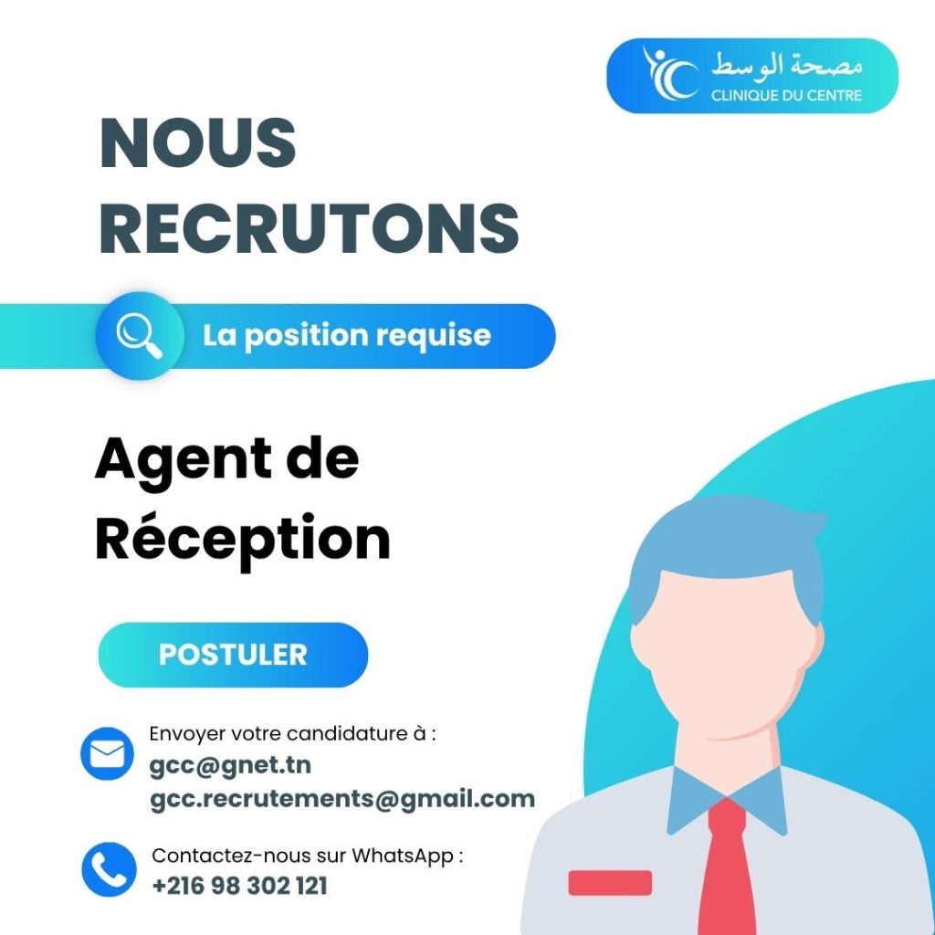 La Clinique du Centre à Ksar Hellal recrute un Agent de Réception pour l’accueil des patients et la gestion administrative de la réception.