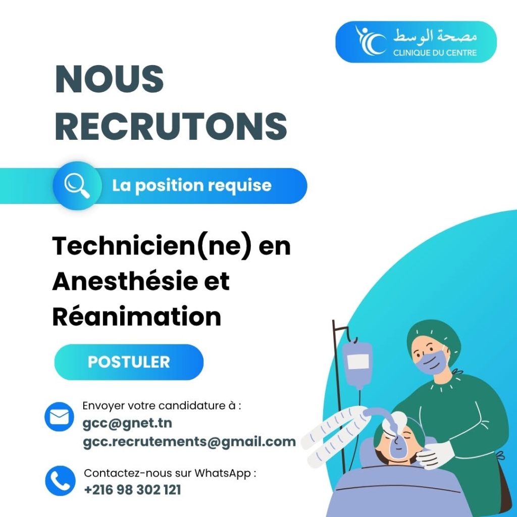 La Clinique du Centre à Ksar Hellal recrute un(e) Infirmier(ère) en Anesthésie et Réanimation pour renforcer son équipe du bloc opératoire.